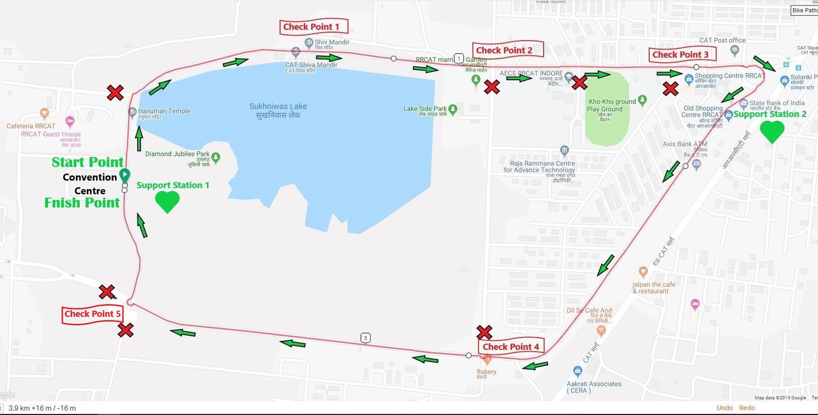 - The tentative route map for the cyclothon is given below and all riders are required to finish four laps of the route. Volunteers will be present to guide the riders in case of confusion.